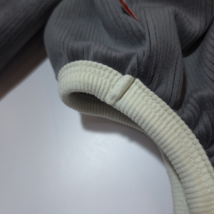 保温性の高い裏起毛地のベロア生地ストライプボディ(ボーダー柄)に同じく裏起毛スパンデニムのロンパース。柔らかく伸縮もあるので動きやすく、そして暖かい。 ネック部分は通常の長さよりも長めのデザインでロ…